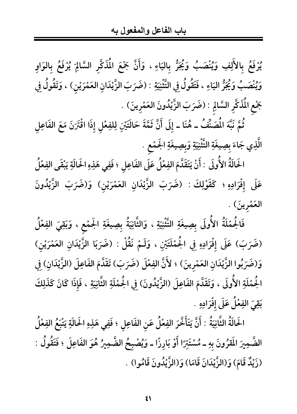 ثُمَّ نَبَّهَ المُصَنِّفُ - هُنَا - إِلَى أَنَّ ثَمَّةَ حَالَتَيْنِ لِلفِعْلِ إِذَا اقْتَرَنَ مَعَ الفَاعِلِ الَّذِي جَاءَ بِصِيغَةِ التَّثْنِيَةِ وَبِصِيغَةِ الجَمْعِ.