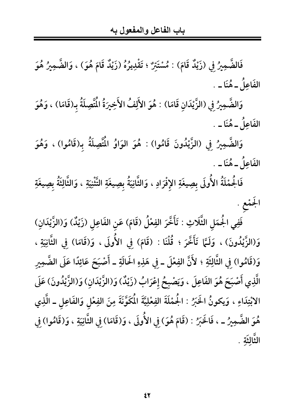فَفِي الجُمَلِ الثَّلَاثِ: تَأَخَّرَ الفِعْلُ (قَامَ) عَنِ الفَاعِلِ (زَيْدٌ) وَ (الزَّيْدَانِ) وَ (الزَّيْدُونَ)، وَلَمَّا تَأَخَّرَ؛ قُلْنَا: (قَامَ) فِي الأُولَى، وَ (قَامَا) فِي الثَّانِيَةِ، وَ (قَامُوا) فِي الثَّالِثَةِ؛ لأَنَّ الفِعْلَ - فِي هَذِهِ الحَالَةِ - أَصْبَحَ عَائِدًا عَلَى الضَّمِيرِ الَّذِي أَصْبَحَ هُوَ الفَاعِلَ، وَيَصْبِحُ إِعْرَابُ (زَيْدٌ) وَ (الزَّيْدَانِ) وَ (الزَّيْدُونَ) عَلَى الابْتِدَاءِ، وَيكونُ الخَبَرُ: الجُمْلَةَ الفِعْلِيَّةَ المُكَوَّنَةَ مِنَ الفِعْلِ وَالفَاعِلِ - الَّذِي هُوَ الضَّمِيرُ -، فَالخَبَرُ: (قَامَ هُوَ) فِي الأُولَى، وَ (قَامَا) فِي الثَّانِيَةِ، وَ (قَامُوا) فِي الثَّالِثَةِ.