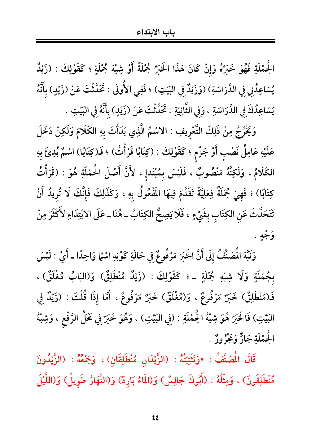 قَالَ المُصَنِّفُ: «وَتَثْنِيَتُهُ: (الزَّيْدَانِ مُنْطَلِقَانِ)، وَجَمْعُهُ: (الزَّيْدُونَ مُنْطَلِقُونَ)، وَمِثْلُهُ: (أَبُوكَ جَالِسٌ) وَ (المَاءُ بَارِدٌ) وَ (النَّهَارُ طَوِيلٌ) وَ (اللَّيْلُ