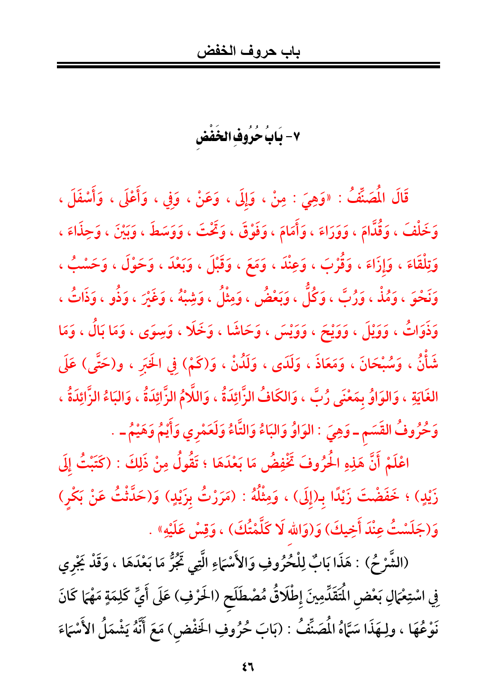 (الشَّرْحُ): هَذَا بَابٌ لِلْحُرُوفِ وَالأَسْمَاءِ الَّتِي تَجُرُّ مَا بَعْدَهَا، وَقَدْ يَجْرِي فِي اسْتِعْمَالِ بَعْضِ المُتَقَدِّمِينَ إِطْلَاقُ مُصْطَلَحِ (الحَرْفِ) عَلَى أَيِّ كَلِمَةٍ مَهْمَا كَانَ نَوْعُهَا، ولِهَذَا سَمَّاهُ المُصَنِّفُ: (بَابَ حُرُوفِ الخَفْضِ) مَعَ أَنَّهُ يَشْمَلُ الأَسْمَاءَ