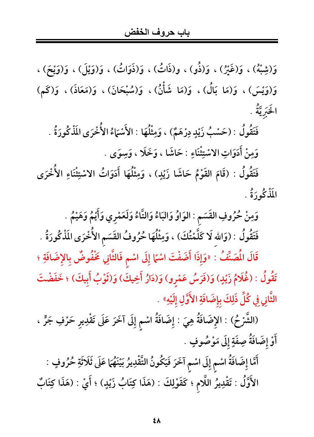 (الشَّرْحُ): الإِضَافَةُ هِيَ: إِضَافَةُ اسْمٍ إِلَى آخَرَ عَلَى تَقْدِيرِ حَرْفِ جَرٍّ، أَوْ إِضَافَةُ صِفَةٍ إِلَى مَوْصُوفٍ.