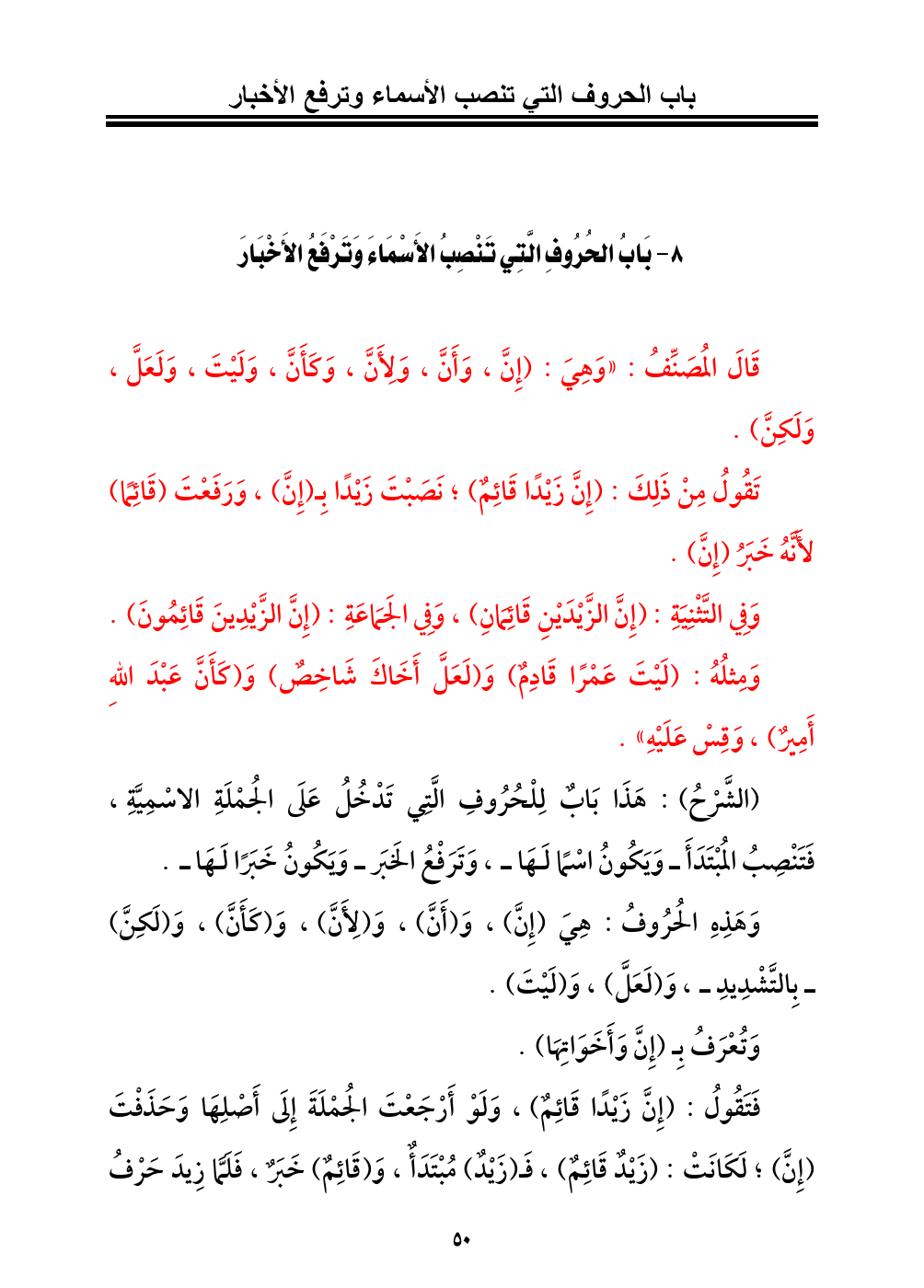 (الشَّرْحُ): هَذَا بَابٌ لِلْحُرُوفِ الَّتِي تَدْخُلُ عَلَى الجُمْلَةِ الاسْمِيَّةِ، فَتَنْصِبُ المُبْتَدَأَ - وَيَكُونُ اسْمًا لَهَا -، وَتَرَفْعُ الخَبَر - وَيَكُونُ خَبَرًا لَهَا -.