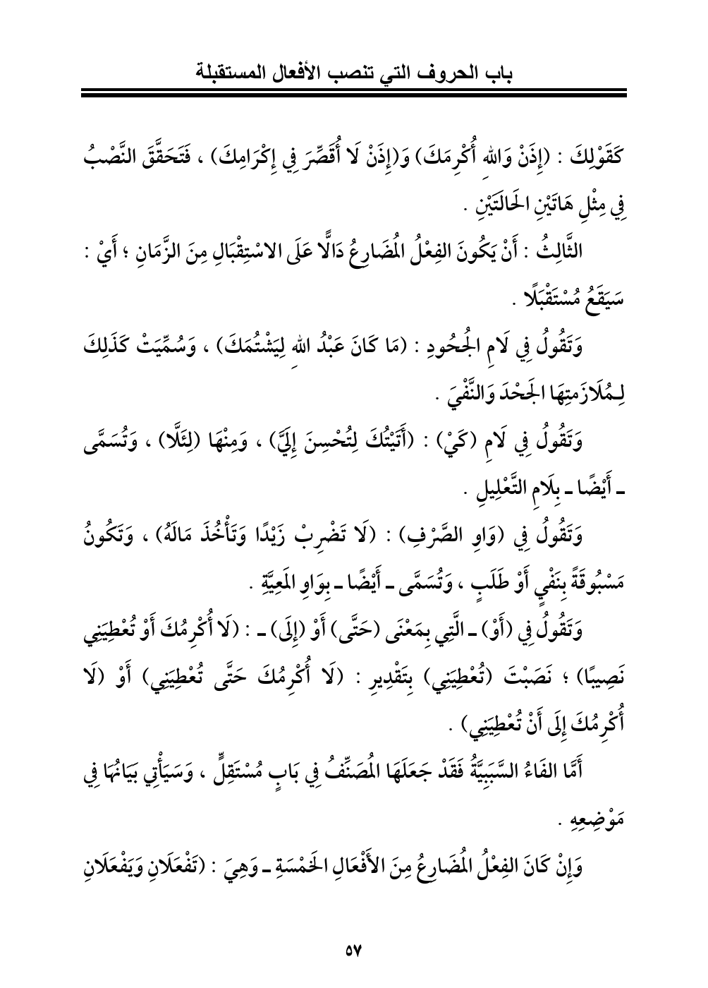 وَتَقُولُ فِي لَامِ (كَيْ): (أَتَيْتُكَ لِتُحْسِنَ إِلَيَّ)، وَمِنْهَا (لِئَلَّا)، وَتُسَمَّى