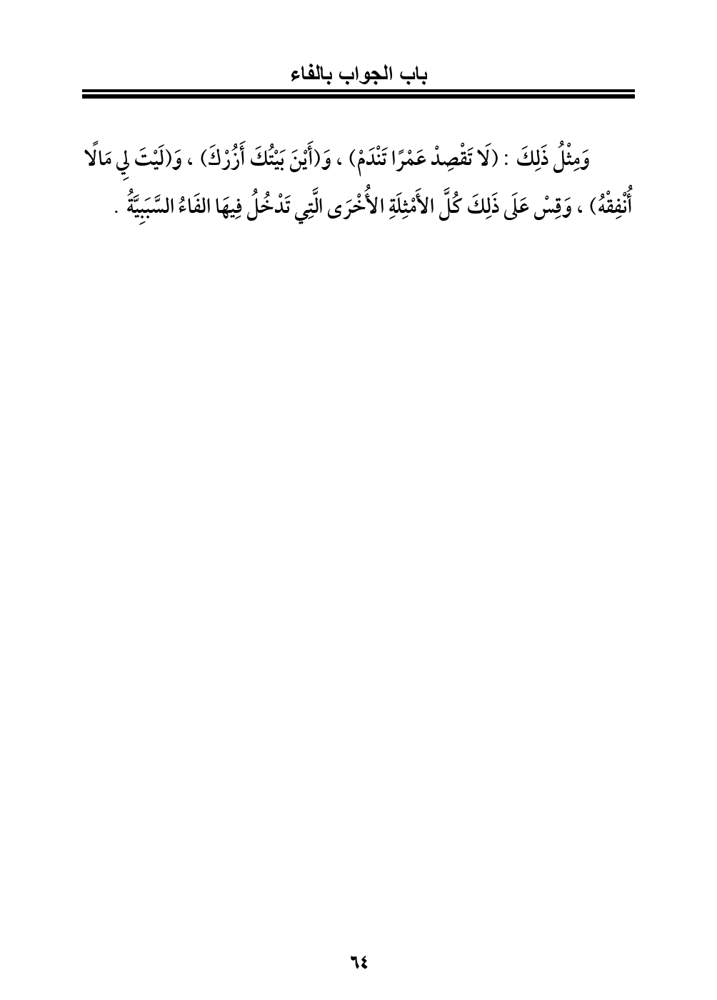 وَمِثْلُ ذَلِكَ: (لَا تَقْصِدْ عَمْرًا تَنْدَمْ)، وَ (أَيْنَ بَيْتُكَ أَزُرْكَ)، وَ (لَيْتَ لِي مَالًا أُنْفِقْهُ)، وَقِسْ عَلَى ذَلِكَ كُلَّ الأَمْثِلَةِ الأُخْرَى الَّتِي تَدْخُلُ فِيهَا الفَاءُ السَّبَبِيَّةُ.