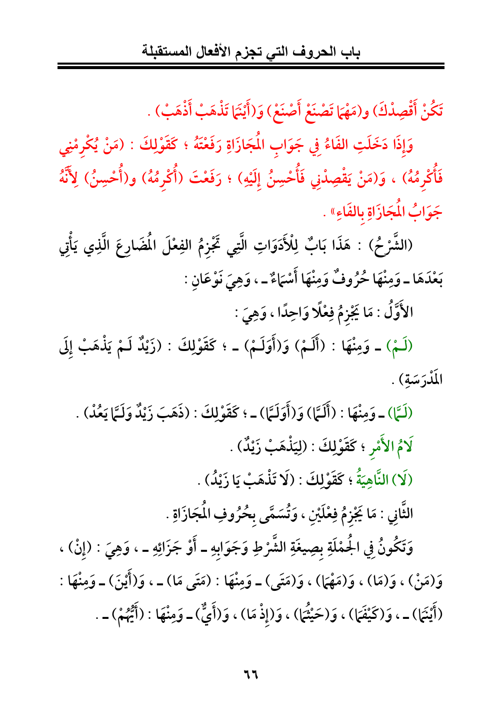 (الشَّرْحُ): هَذَا بَابٌ لِلْأَدَوَاتِ الَّتِي تَجْزِمُ الفِعْلَ المُضَارِعَ الَّذِي يَاتِي بَعْدَهَا - وَمِنْهَا حُرُوفٌ وَمِنْهَا أَسْمَاءٌ -، وَهِيَ نَوْعَانِ: