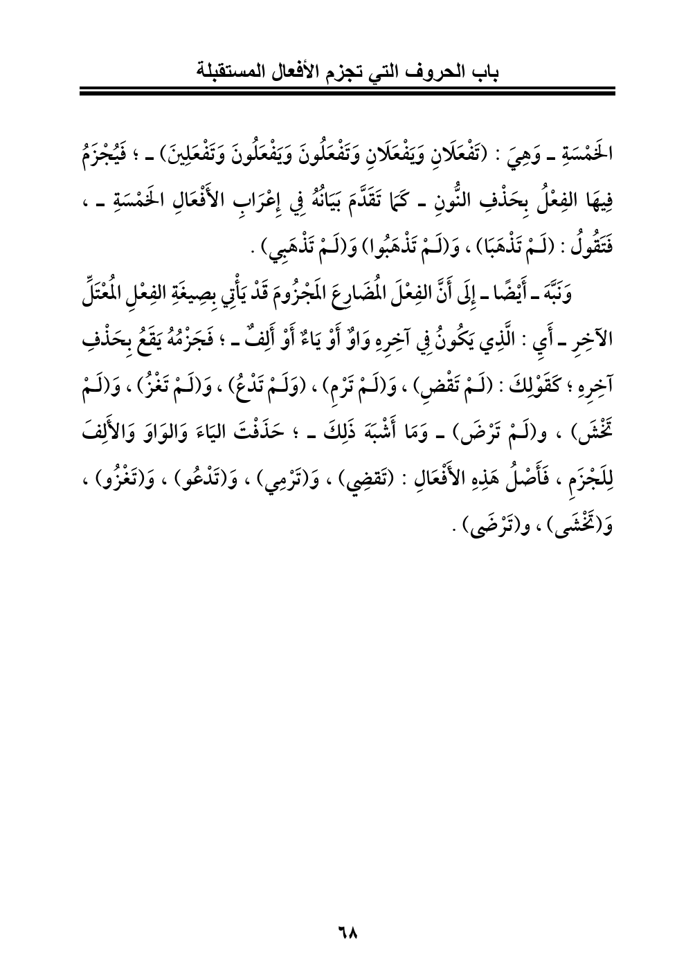 تَخْشَ)، و (لَمْ تَرْضَ) - وَمَا أَشْبَهَ ذَلِكَ -؛ حَذَفْتَ اليَاءَ وَالوَاوَ وَالأَلِفَ لِلَجْزَمِ، فَأَصْلُ هَذِهِ الأَفْعَالِ: (تَقضِي)، وَ (تَرْمِي)، وَ (تَدْعُو)، وَ (تَغْزُو)، وَ (تَخْشَى)، و (تَرْضَى).