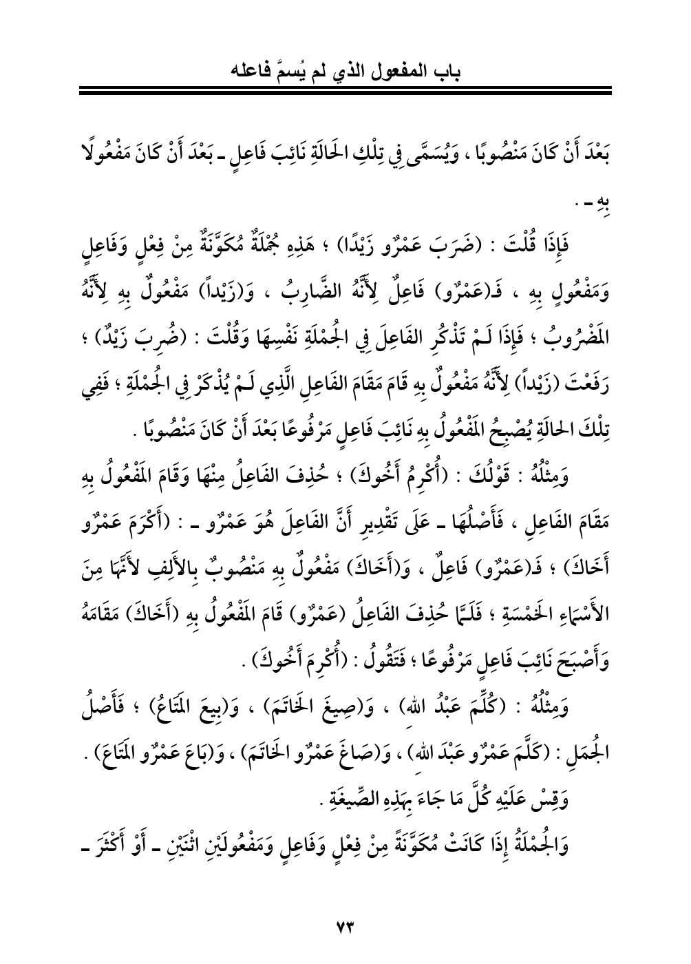 بَعْدَ أَنْ كَانَ مَنْصُوبًا، وَيُسَمَّى فِي تِلْكِ الحَالَةِ نَائِبَ فَاعِلٍ - بَعْدَ أَنْ كَانَ مَفْعُولًا بِهِ -.