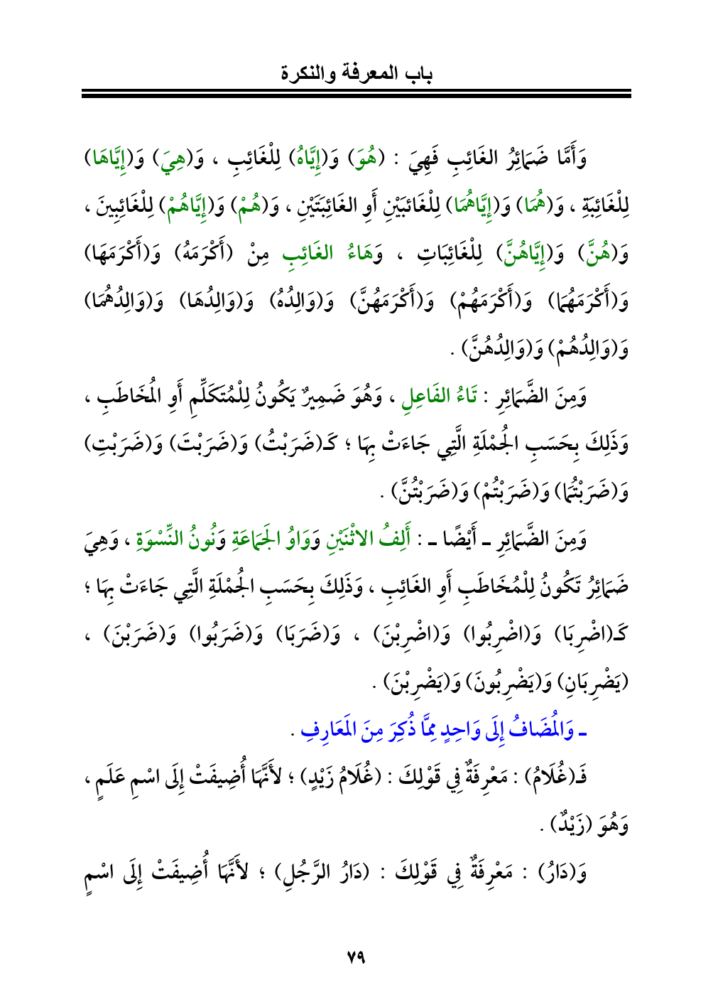 فَـ (غُلَامُ): مَعْرِفَةٌ فِي قَوْلِكَ: (غُلَامُ زَيْدٍ)؛ لأَنَّهَا أُضِيفَتْ إِلَى اسْمِ عَلَمٍ، وَهُوَ (زَيْدٌ).