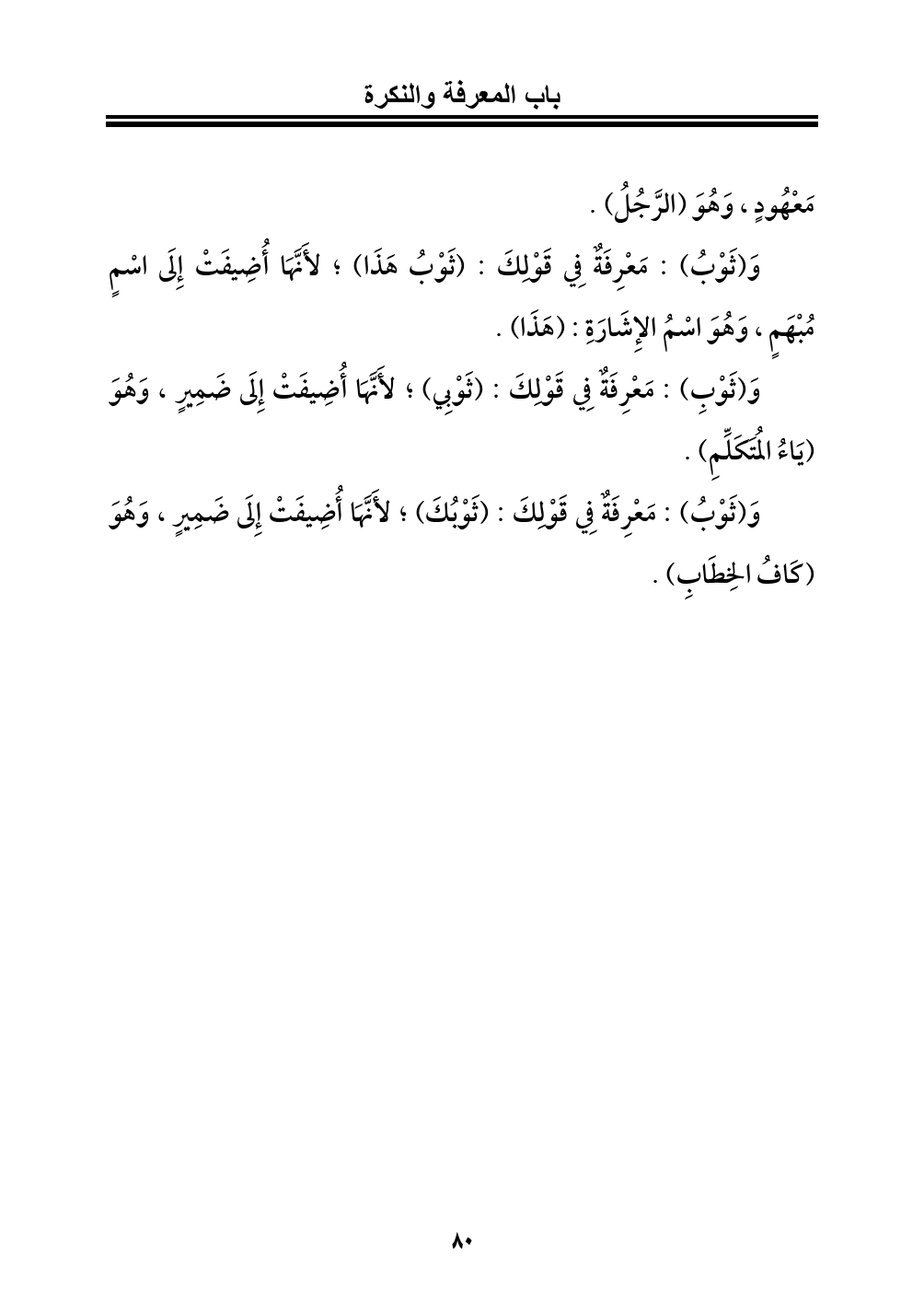 وَ (ثَوْبُ): مَعْرِفَةٌ فِي قَوْلِكَ: (ثَوْبُكَ)؛ لأَنَّهَا أُضِيفَتْ إِلَى ضَمِيرٍ، وَهُوَ (كَافُ الخِطَابِ).