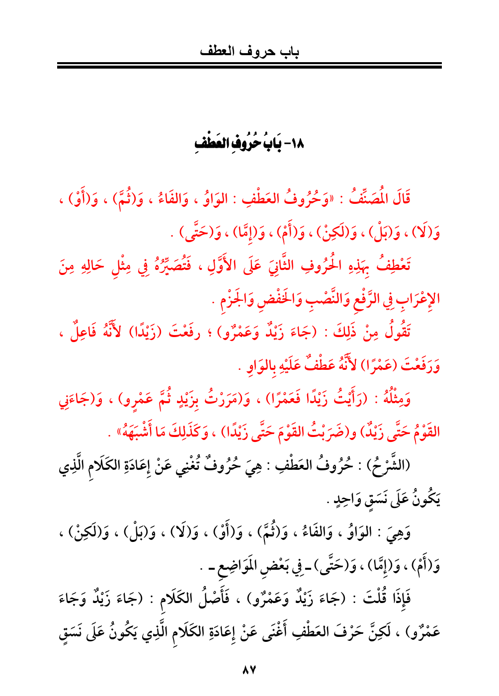 قَالَ المُصَنِّفُ: «وَحُرُوفُ العَطْفِ: الوَاوُ، وَالفَاءُ، وَ (ثُمَّ)، وَ (أَوْ)، وَ (لَا)، وَ (بَلْ)، وَ (لَكِنْ)، وَ (أَمْ)، وَ (إِمَّا)، وَ (حَتَّى).