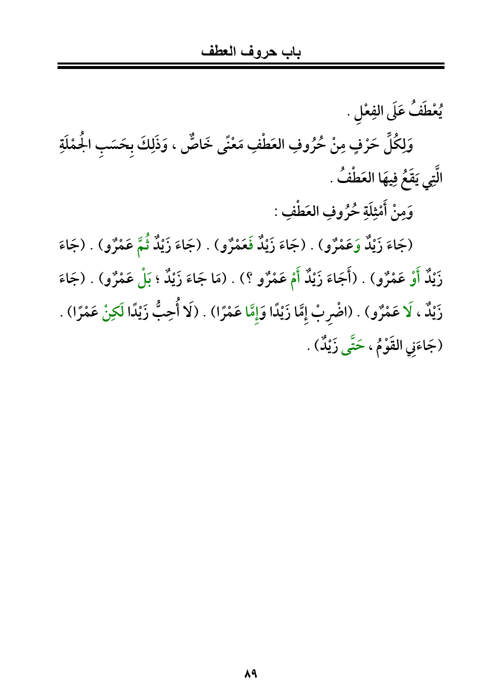 (جَاءَ زَيْدٌ وَعَمْرٌو). (جَاءَ زَيْدٌ فَعَمْرٌو). (جَاءَ زَيْدٌ ثُمَّ عَمْرٌو). (جَاءَ زَيْدٌ أَوْ عَمْرٌو). (أَجَاءَ زَيْدٌ أَمْ عَمْرٌو؟). (مَا جَاءَ زَيْدٌ؛ بَلْ عَمْرٌو). (جَاءَ زَيْدٌ، لَا عَمْرٌو). (اضْرِبْ إِمَّا زَيْدًا وَإِمَّا عَمْرًا). (لَا أُحِبُّ زَيْدًا لَكِنْ عَمْرًا). (جَاءَنِي القَوْمُ، حَتَّى زَيْدٌ).