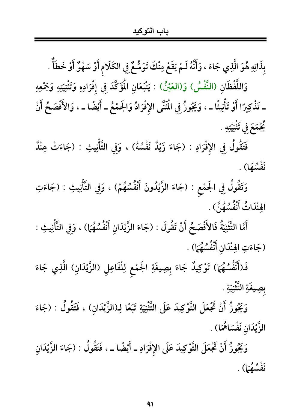 وَتَقُولُ فِي الجَمْعِ: (جَاءَ الزَّيْدُونَ أَنْفُسُهُمْ)، وَفِي التَّانِيثِ: (جَاءَتِ الهِنْدَاتُ أَنْفُسُهُنَّ).