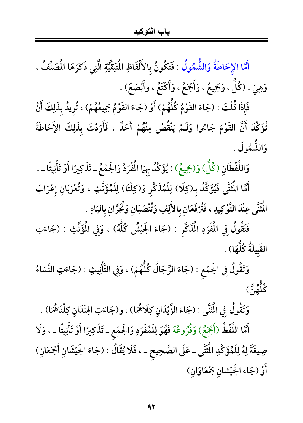 وَتَقُولُ فِي الجَمْعِ: (جَاءَ الرِّجَالُ كُلُّهُمْ)، وَفِي التَّانِيثِ: (جَاءَتِ النِّسَاءُ كُلُّهُنَّ).