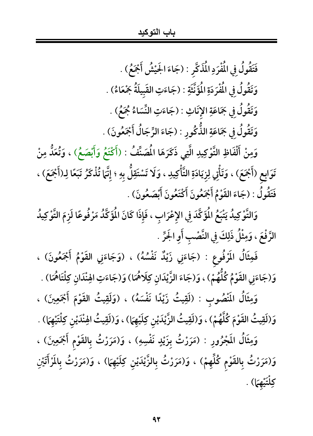 وَمِنْ أَلْفَاظِ التَّوْكِيدِ الَّتِي ذَكَرَهَا المُصَنِّفُ: (أَكْتَعُ وَأَبْصَعُ)، وَتُعَدُّ مِنْ تَوَابِعِ (أَجْمَعَ)، وَتَاتِي لِزِيَادَةِ التَّاكِيدِ، وَلَا تَسْتَقِلُّ بِهِ؛ إِنَّمَا تُذْكَرُ تَبَعًا لِـ (أَجْمَعَ)، فَتَقُولُ: (جَاءَ القَوْمُ أَجْمَعُونَ أَكْتَعُونَ أَبْصَعُونَ).