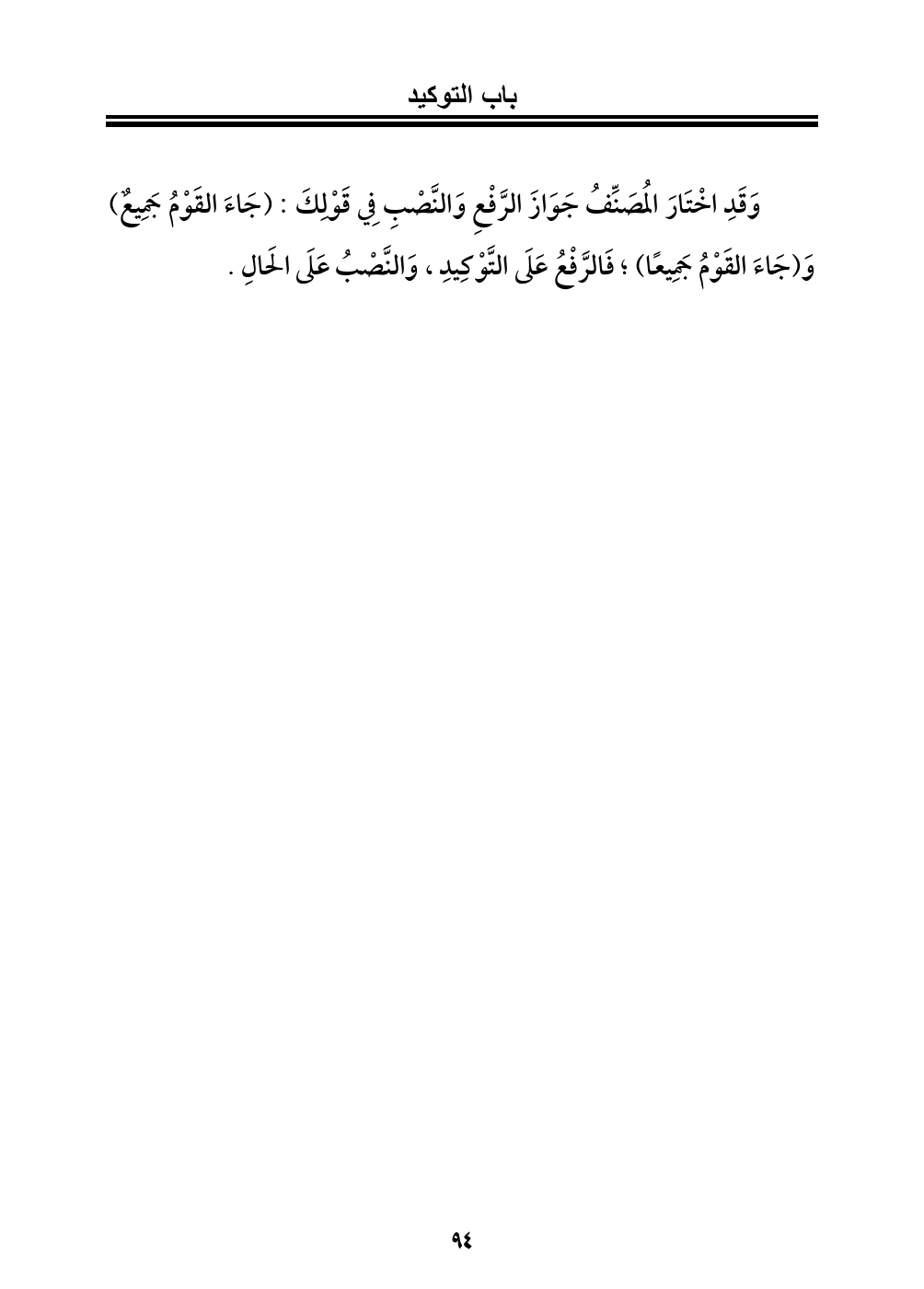 وَقَدِ اخْتَارَ المُصَنِّفُ جَوَازَ الرَّفْعِ وَالنَّصْبِ فِي قَوْلِكَ: (جَاءَ القَوْمُ جَمِيعٌ) وَ (جَاءَ القَوْمُ جَمِيعًا)؛ فَالرَّفْعُ عَلَى التَّوْكِيدِ، وَالنَّصْبُ عَلَى الحَالِ.