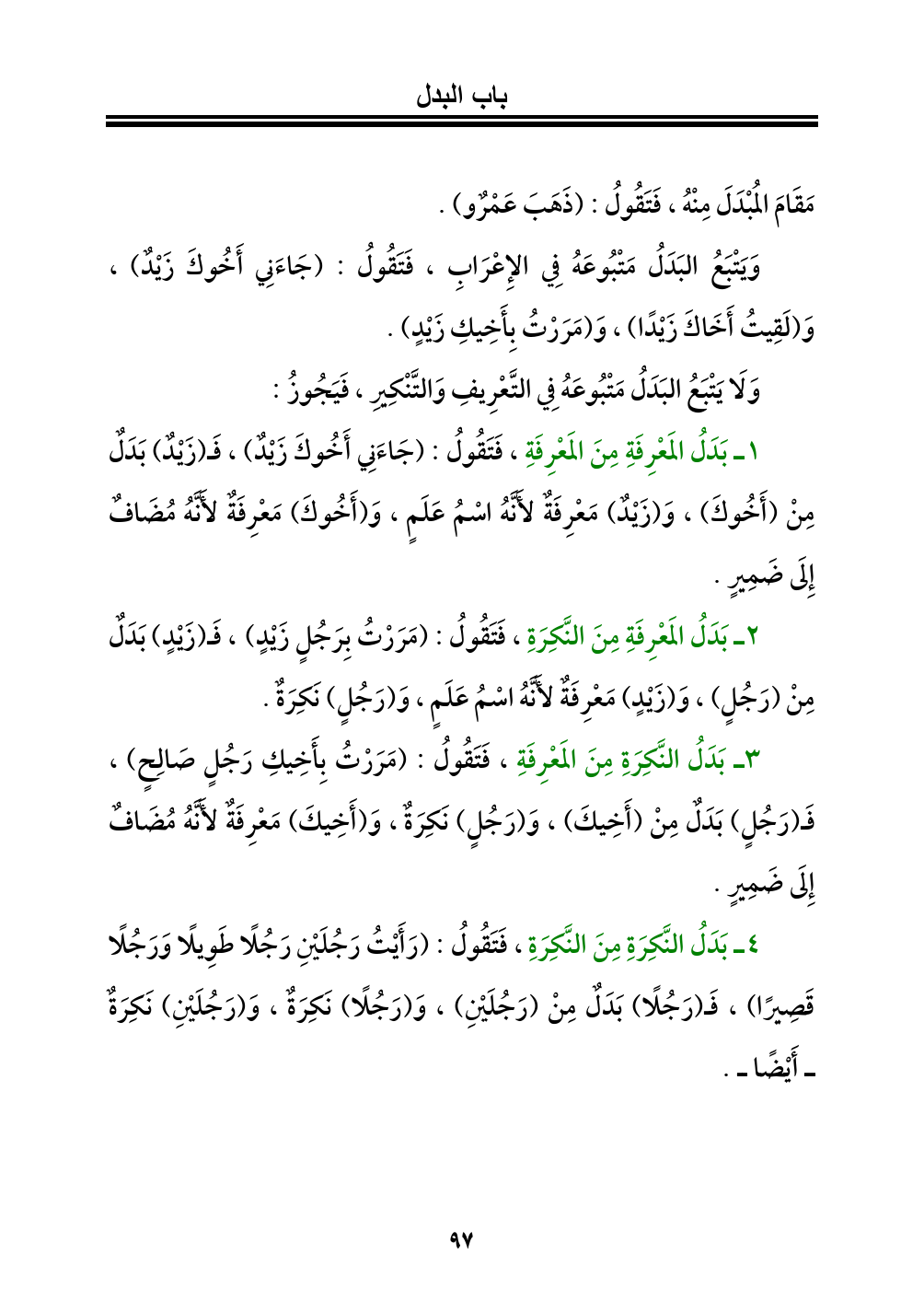 3 - بَدَلُ النَّكِرَةِ مِنَ المَعْرِفَةِ، فَتَقُولُ: (مَرَرْتُ بِأَخِيكِ رَجُلٍ صَالِحٍ)، فَـ (رَجُلٍ) بَدَلٌ مِنْ (أَخِيكَ)، وَ (رَجُلٍ) نَكِرَةٌ، وَ (أَخِيكَ) مَعْرِفَةٌ لأَنَّهُ مُضَافٌ إِلَى ضَمِيرٍ.