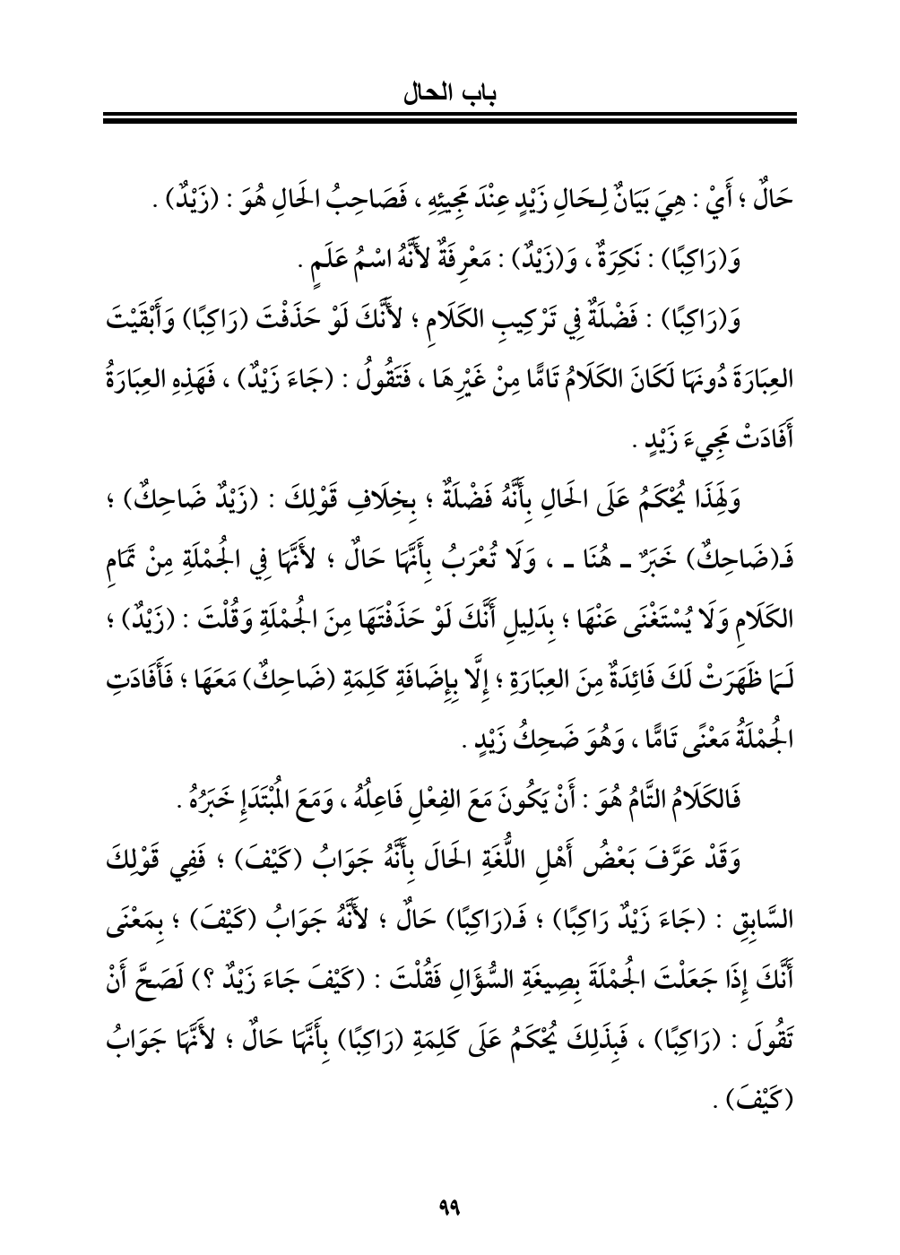 وَلِهَذَا يُحْكَمُ عَلَى الحَالِ بِأَنَّهُ فَضْلَةٌ؛ بِخِلَافِ قَوْلِكَ: (زَيْدٌ ضَاحِكٌ)؛ فَـ (ضَاحِكٌ) خَبَرٌ - هُنَا -، وَلَا تُعْرَبُ بِأَنَّهَا حَالٌ؛ لأَنَّهَا فِي الجُمْلَةِ مِنْ تَمَامِ الكَلَامِ وَلَا يُسْتَغْنَى عَنْهَا؛ بِدَلِيلِ أَنَّكَ لَوْ حَذَفْتَهَا مِنَ الجُمْلَةِ وَقُلْتَ: (زَيْدٌ)؛ لَمَا ظَهَرَتْ لَكَ فَائِدَةٌ مِنَ العِبَارَةِ؛ إِلَّا بِإِضَافَةِ كَلِمَةِ (ضَاحِكٌ) مَعَهَا؛ فَأَفَادَتِ الجُمْلَةُ مَعْنًى تَامًّا، وَهُوَ ضَحِكُ زَيْدٍ.