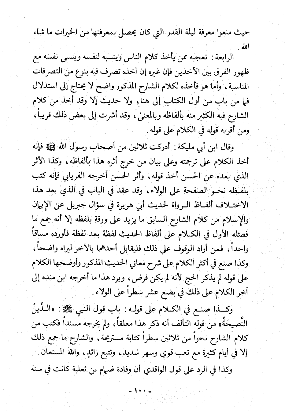 وكذا صنع في الكلام على قوله: باب قول النّبيّ - صلّى الله عليه وسلم -: "الدِّينُ النَّصيحَةُ" من قوله التألف أنّه ذكر هذا معلقًا، ولم يخرجه مُسْنَدًا فكتب من كلام الشارح نحوًا من ثلاثين سطرًا كتابة مستريحة، والشارح ما جمع ذلك إِلَّا في أيّام كثيرة مع تعب قوي وسهر شديد، وتتبع زائدٍ، والله المستعان.