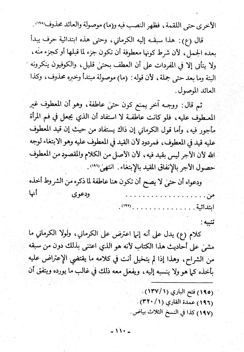كلام (ع) يدلُّ على أنّه إنّما اعترض على الكرماني، ولولا الكرماني ما مشى على أحاديث هذا الكتاب لأنّه هو الذي اعتنى بذلك دون من سبقه من الشراح، وهذا إذا لم تتخيل أنت في كلامه ما يقتضي الإِعتراض عليه بأخذه كما هو ولا ينسبه إليه، ويفعل معه ذلك في غالب ما يورده ويتفق أن