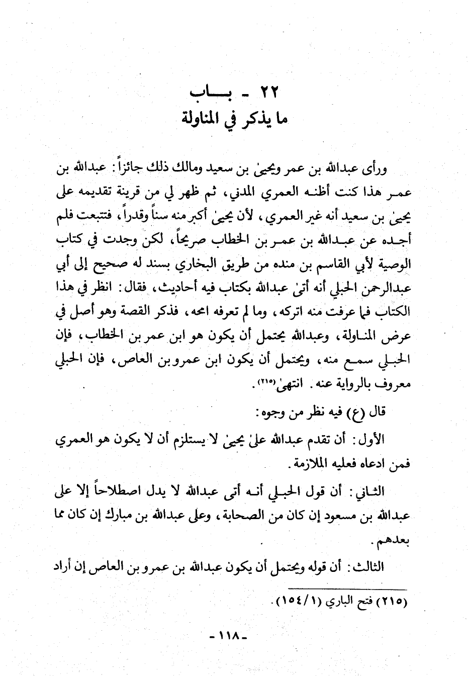 ورأى عبد الله بن عمر ويحيى بن سعيد ومالك ذلك جائزًا: عبد الله بن عمر هذا كنت أظنه العمري المدني، ثمّ ظهر لي من قرينة تقديمه على يحيى بن سعيد أنّه غير العمري، لأنّ يحيى أكبر منه سنًا وقدرًا، فتتبعت فلم أجده عن عبد الله بن عمر بن الخطّاب صريحًا، لكن وجدت في كتاب الوصيَّة لأبي القاسم بن منده من طريق البخاريّ بسند له صحيح إلى أبي عبد الرّحمن الحبلي أنّه أتى عبد الله بكتاب فيه أحاديث، فقال: انظر في هذا الكتاب فما عرفت منه اتركه، وما لم تعرفه امحه، فذكر القصة وهو أصل في عرض المناولة، وعبد الله يحتمل أن يكون هو ابن عمر بن الخطّاب، فإن الحبلي سمع منه، ويحتمل أن يكون ابن عمرو بن العاص، فإن الحبلي معروف بالرواية عنه. انتهى (¬215).