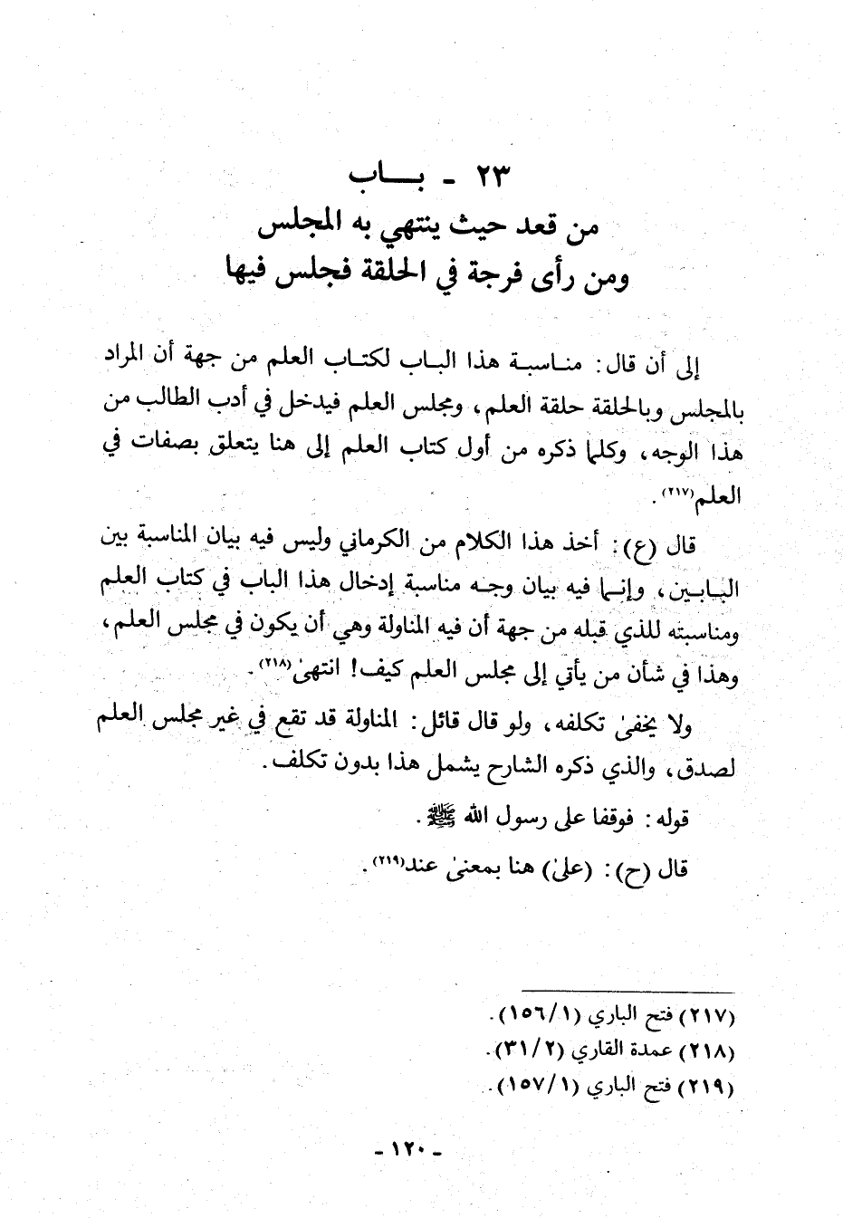 إلى أن قال: مناسبة هذا الباب لكتاب العلم من جهة أن المراد بالمجلس وبالحلقة حلقة العلم، ومجلس العلم فيدخل في أدب الطالب من هذا الوجه، وكلما ذكره من أول كتاب العلم إلى هنا يتعلّق بصفات في العلم (¬217).