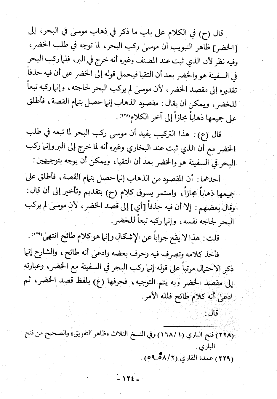 قال (ح) في الكلام على باب ما ذكر في ذهاب موسى في البحر، إلى [الخضر] ظاهر التبويب أن موسى ركب البحر، لما توجه في طلب الخضر، وفيه نظر لأنّ الذي ثبت عند المصنف وغيره أنّه خرج في البرّ، فلما ركب البحر في السفينة هو والخضر بعد أن التقيا فيحمل قوله إلى الخضر على أن فيه حذفًا تقديره إلى مقصد الخضر، لأنّ موسى لم يركب البحر لحاجته، وإنّما ركبه تبعًا للخضر، ويمكن أن يقال: مقصود الذهاب إنّما حصل بتمام القصة، فأطلق على جميعها ذهابًا مجازًا إلى آخر الكلام (¬228).
