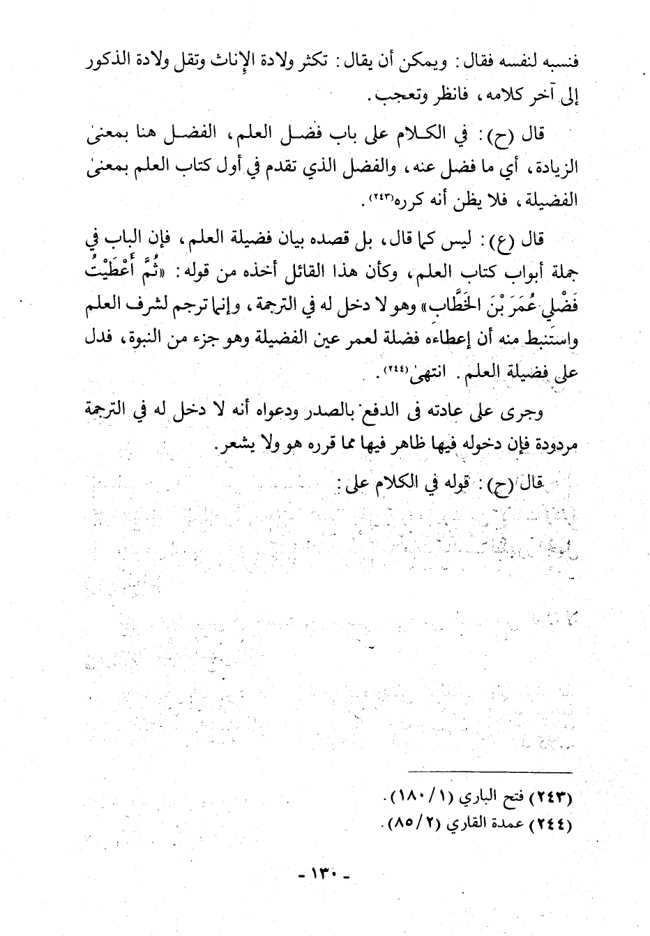قال (ع): ليس كما قال، بل قصده بيان فضيلة العلم، فإن الباب في جملة أبواب كتاب العلم، وكأن هذا القائل أخذه من قوله: "ثُمَّ أعْطَيْتُ فَضْلي عُمَرَ بْنَ الخَطَّابِ" وهو لا دخل له في التّرجمة، وإنّما ترجم لشرف العلم واستَنبط منه أن إعطاءه فضلة لعمر عين الفضيلة وهو جزء من النبوة، فدل على فضيلة العلم. انتهى (¬244).