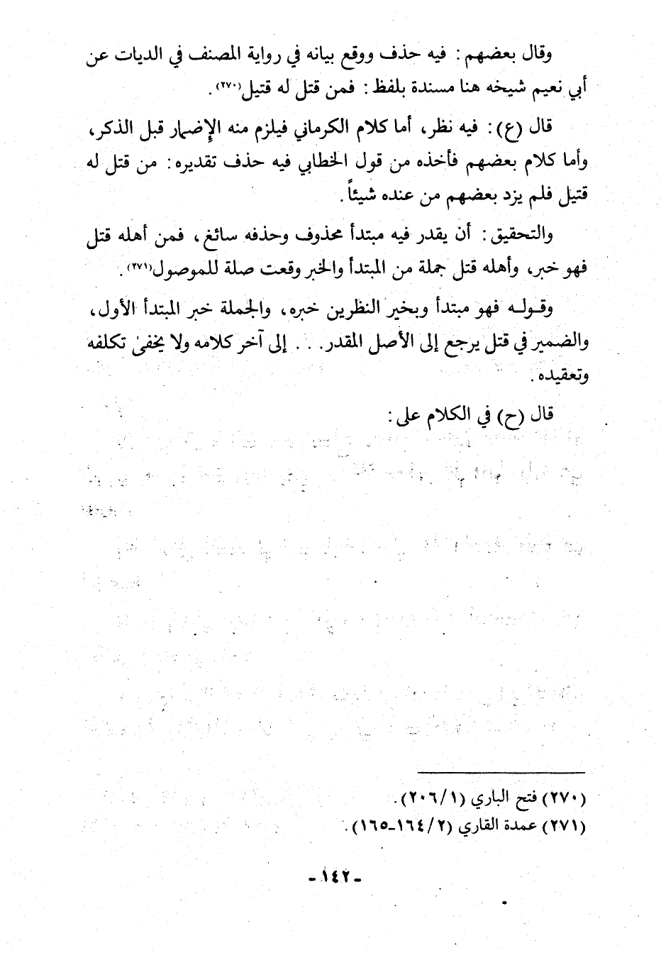 قال (ع): فيه نظر، أمّا كلام الكرماني فيلزم منه الإِضمار قبل الذكر، وأمّا كلام بعضهم فأخذه من قول الخطابي فيه حذف تقديره: من قتل له قتيل فلم يزد بعضهم من عنده شيئًا.
