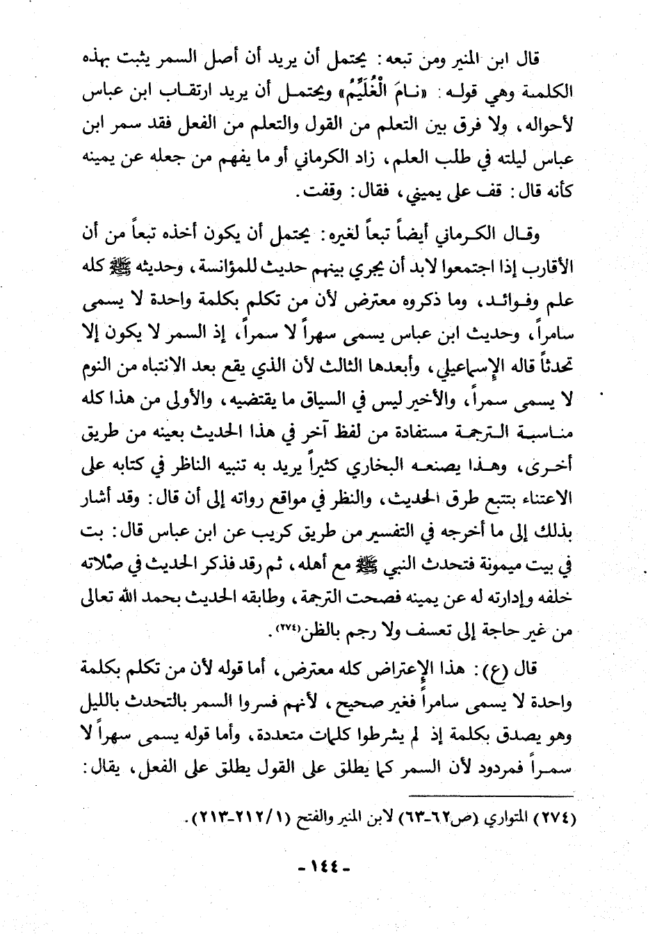 قال (ع): هذا الاعتراض كله معترض، أمّا قوله لأنّ من تكلم بكلمة واحدة لا يسمى سامرًا فغير صحيح، لأنّهم فسروا السمر بالتحدث بالليل وهو يصدق بكلمة إذ لم يشرطوا كلمات متعددة، وأمّا قوله يسمى سهرًا لا سمرًا فمردود لأنّ السمر كما يطلق على القول يطلق على الفعل، يقال: