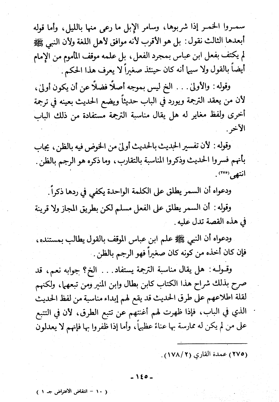 وقوله: لأنّ تفسير الحديث بالحديث أول من الخوض فيه بالظن، يجاب بأنّهم فسروا الحديث وذكروا المناسبة بالتقارب، وما ذكره هو الرَّجْم بالظن. انتهى (¬275).