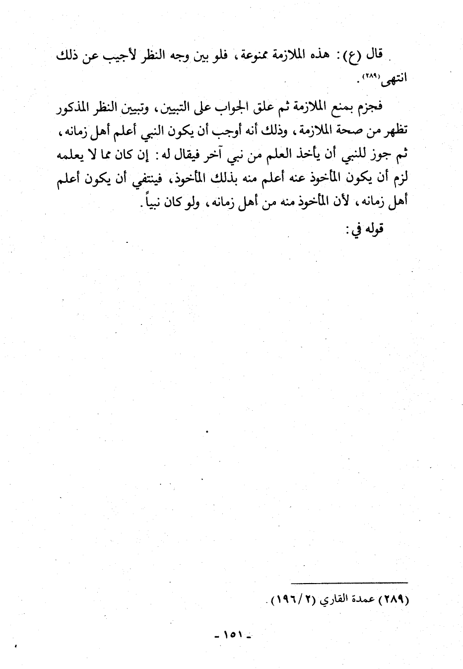 فجزم بمنع الملازمة ثم علق الجواب على التبيين، وتبيين النظر المذكور تظهر من صحة الملازمة، وذلك أنه أوجب أن يكون النبي أعلم أهل زمانه، ثم جوز للنبي أن يأخذ العلم من نبي آخر فيقال له: إن كان مما لا يعلمه لزم أن يكون المأخوذ عنه أعلم منه بذلك المأخوذ، فينتفي أن يكون أعلم أهل زمانه، لأن المأخوذ منه من أهل زمانه، ولو كان نبيًا.