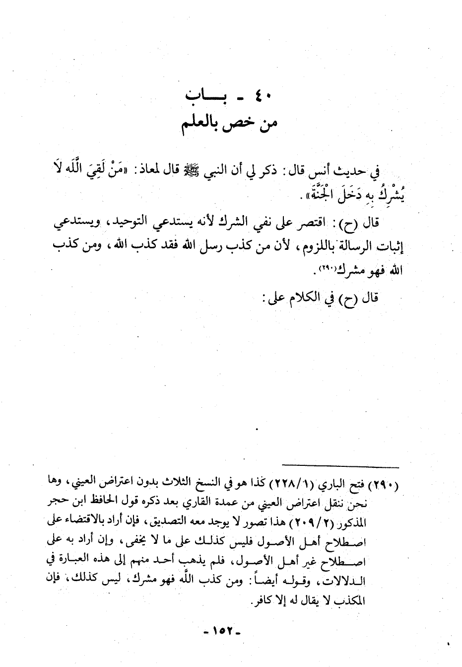 (¬290) فتح الباري (1/ 228) كذا هو في النسخ الثلاث بدون اعتراض العيني، وها نحن ننقل اعتراض العيني من عمدة القاري بعد ذكره قول الحافظ ابن حجر المذكور (2/ 209) هذا تصور لا يوجد معه التصديق، فإن أراد بالاقتضاء على اصطلاح أهل الأصول فليس كذلك على ما لا يخفى، وإن أراد به على اصطلاح غير أهل الأصول، فلم يذهب أحد منهم إلى هذه العبارة في الدلالات، وقوله أيضًا: ومن كذب الله فهو مشرك، ليس كذلك، فإن المكذب لا يقال له إِلَّا كافر.