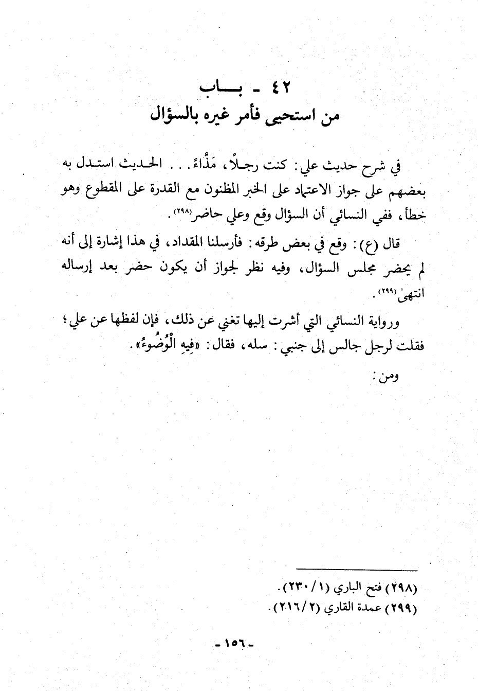 في شرح حديث علي: كنت رجلًا، مَذَّاءً ... الحديث استدل به بعضهم على جواز الاعتماد على الخبر المظنون مع القدرة على المقطوع وهو خطأ، ففي النسائي أن السؤال وقع وعلي حاضر (¬298).