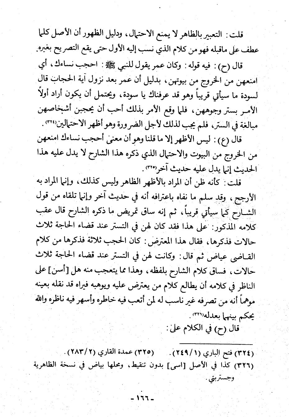 قلت: كأنّه ظن أن المراد بالأظهر الظّاهر وليس كذلك، وإنّما المراد به الأرجح، وقد سلم ما نفاه باعترافه أنّه في حديث آخر وإنّما تلقاه من قول الشارح كما سيأتي قريبًا، ثمّ إنّه ساق تمريض ما ذكره الشارح قال عقب كلامه المذكور: على هذا فقد كان لهن في التستر عند قضاء الحاجة ثلاث حالات فذكرها، فقال هذا المعترض: كان الحجب ثلاثة فذكرها من كلام القاضي عياض ثمّ قال: وكانت لهن في التستر عند قضاء الحاجة ثلاث حالات، فساق كلام الشارح بلفظه، وهذا ممّا يتعجب منه هل [أسن] على الناظر في كلامه أن يطالع كلام من يعترض عليه ويوهبه فيراه قد نقله بعينه موهمًا أنّه من تصرفه غير ناسب له لمن أتعب فيه خاطره وأسهر فيه ناظره والله يحكم بينهما بعدله (¬326).
