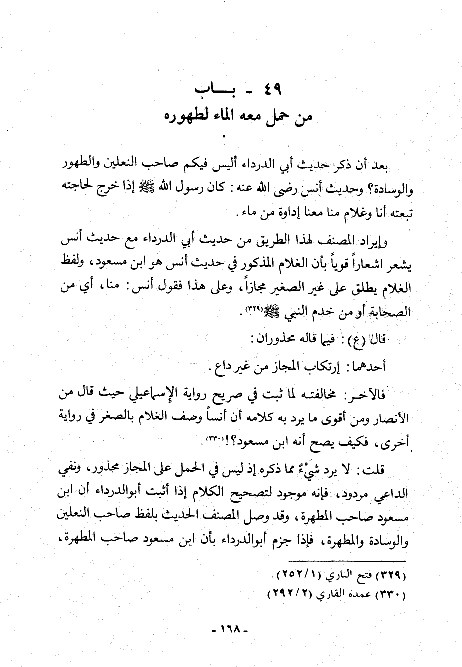 بعد أن ذكر حديث أبي الدرداء أليس فيكم صاحب النعلين والطهور والوسادة؟ وحديث أِنس رضي الله عنه: كان رسول الله - صلّى الله عليه وسلم - إذا خرج لحاجته تبعته أنا وغلام منا معنا إداوة من ماء.
