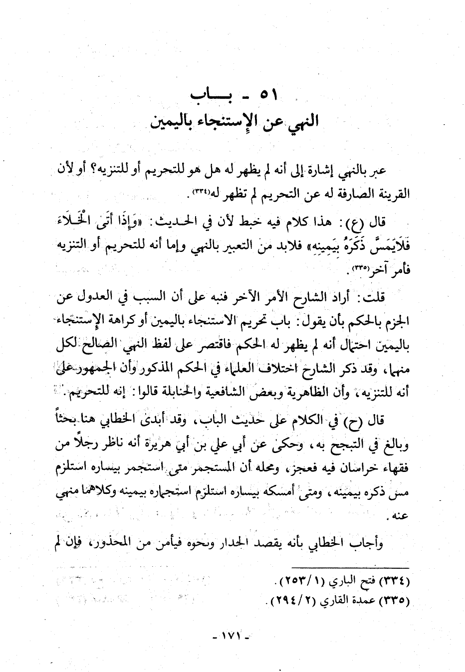 قلت: أراد الشارح الأمر الآخر فنبه على أن السبب في العدول عن الجزم بالحكم بأن يقول: باب تحريم الإستنجاء باليمين أو كراهة الإِستنجاء باليمين احتمال أنّه لم يظهر له الحكم فاقتصر على لفظ النّهي الصالح لكل منهما، وقذ ذكر الشارح اختلاف العلماء في الحكم المذكور وأن الجمهور على أنّه للتنزيه، وأن الظاهرية وبعض الشّافعيّة والحنابلة قالوا: إنّه للتحريم