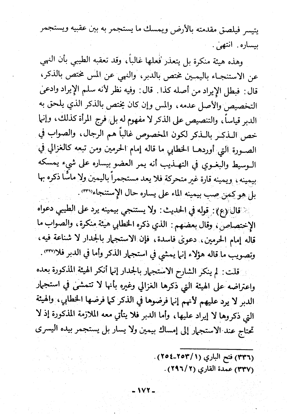 قلت: لم ينكر الشارح الاستجمار بالجدار إنّما أنكر الهيئة المذكورة بعده واعتراضه على الهيئة الّتي ذكرها الغزالي وغيره بأنّها لا تتمشى في استجمار الدبر لا يردّ. عليهم لأنّهم إنّما فرضوها في الذكر كما فرضها الخطابي، والهيئة الّتي ذكروها لا إيراد عليها، وأمّا الدبر فلا يتأتي معه الملازمة المذكورة إذ لا تحتاج عند الاستجمار إلى إمساك بيمين ولا يسار بل يستجمر بيده اليسرى