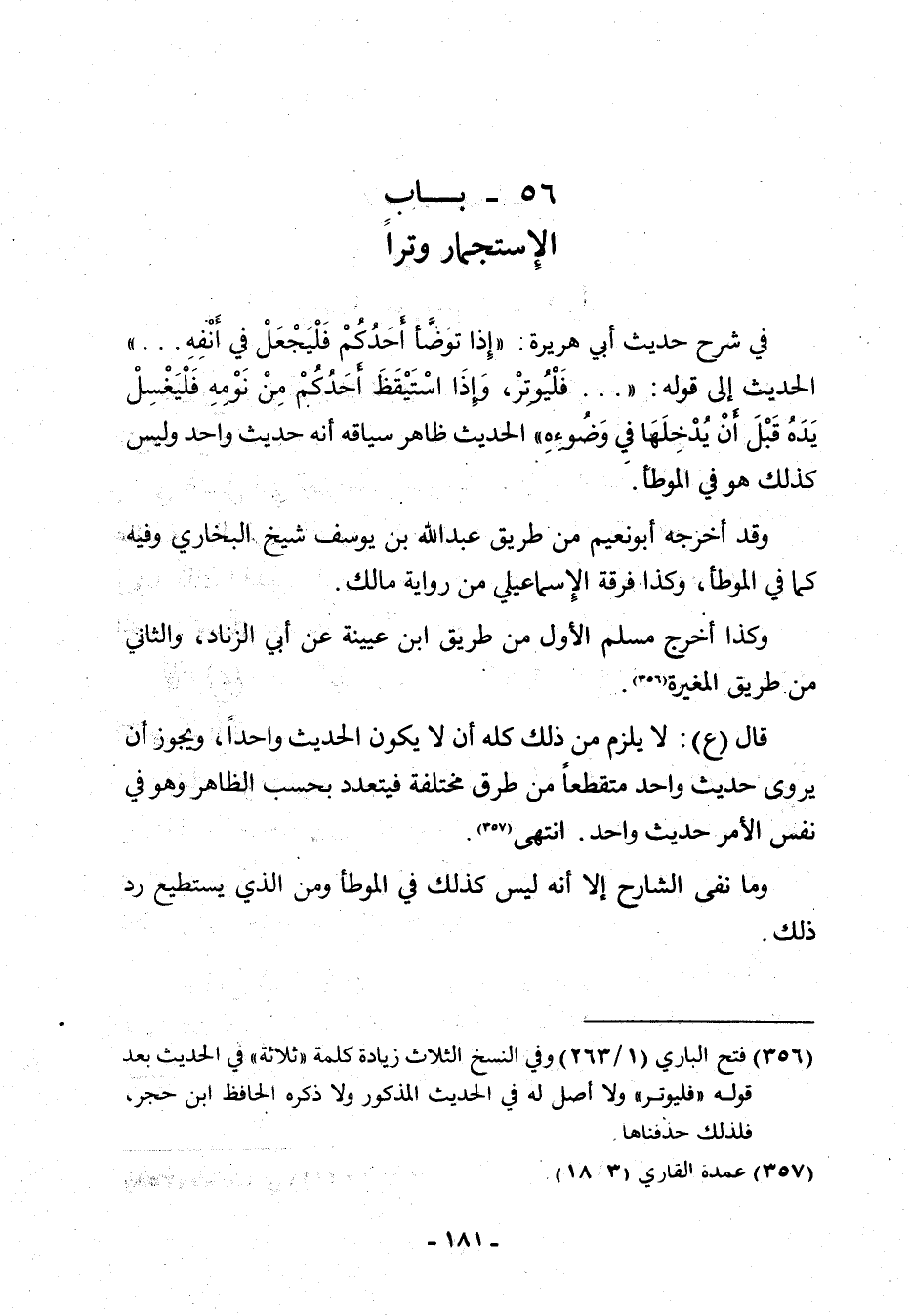 (¬356) فتح الباري (1/ 263) وفي النسخ الثلاث زيادة كلمة "ثلاثة" في الحديث بعد قوله "فليوتر" ولا أصل له في الحديث المذكور ولا ذكره الحافظ ابن حجر، فلذلك حذفناها.