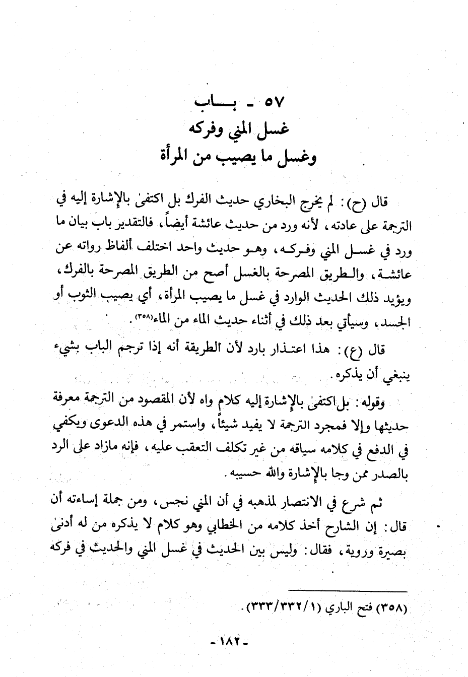 ثمّ شرع في الانتصار لمذهبه في أن المني نجس, ومن جملة إساءته أن قال: إن الشارح أخذ كلامه من الخطابي وهو كلام لا يذكره من له أدنى بصيرة وروية, فقال: وليس بين الحديث في غسل المني والحديث في فركه