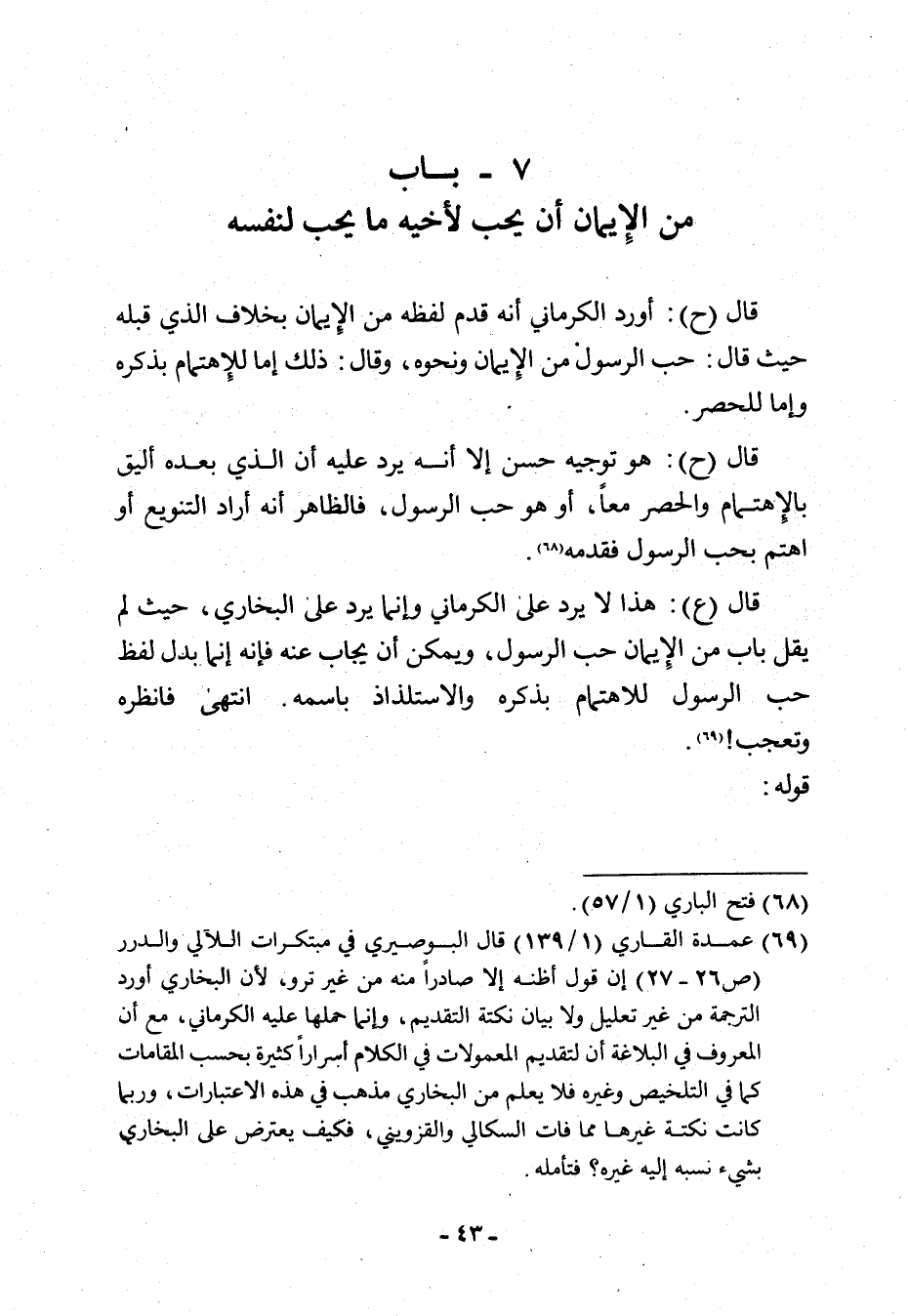 قال (ع): هذا لا يرد على الكرماني وإنّما يرد على البخاريّ، حيث لم يقل باب من الإِيمان حب الرسول، ويمكن أن يجاب عنه فإنّه إنّما بدل لفظ حب الرسول للاهتمام بذكره والاستلذاذ باسمه. انتهى فانظره وتعجب! (¬69).