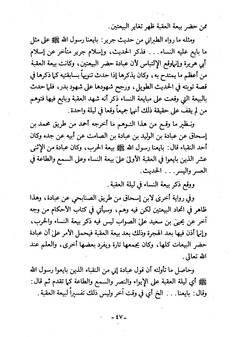 ومثله ما رواه الطبراني من حديث جرير: بايعنا رسول الله - صلّى الله عليه وسلم - على مثل ما بايع عليه النِّساء ... فذكر الحديث، وإسلام جرير متأخر عن إسلام أبي هريرة وإنّما وقع الإلتباس لأنّ عبادة حضر البيعتين، وكانت بيعة العقبة من أعظم ما يمتدح به، وكان يذكرها إذا حدث تنويهًا بسابقتيه كما ذكرها في قصة توبته في الحديث الطويل، ورجح شهودها على شهود بدر، فلما حدث بالبيعة الّتي وقعت على مبايعة النِّساء ذكر أنّه شهد العقبة وبايع فيها فتوهم من لم يقف على حقيقة ذلك أنّهما جميعًا وقعا في ليلة واحدة.