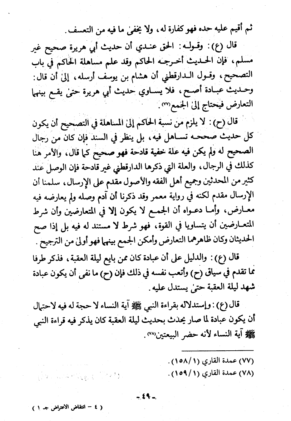 قال (ع): وقوله: الحق عندي أن حديث أن هريرة صحيح غير مسلم، فإن الحديث أخرجه الحاكم وقد علم مساهلة الحاكم في باب التصحيح، وقول الدارقطني أن هشام بن يوسف أرسله، إلى أن قال: وحديث عبادة أصح، فلا يساوي حديث أبي هريرة حتّى يقع بينهما التعارض فيحتاج إلى الجمع (¬77).