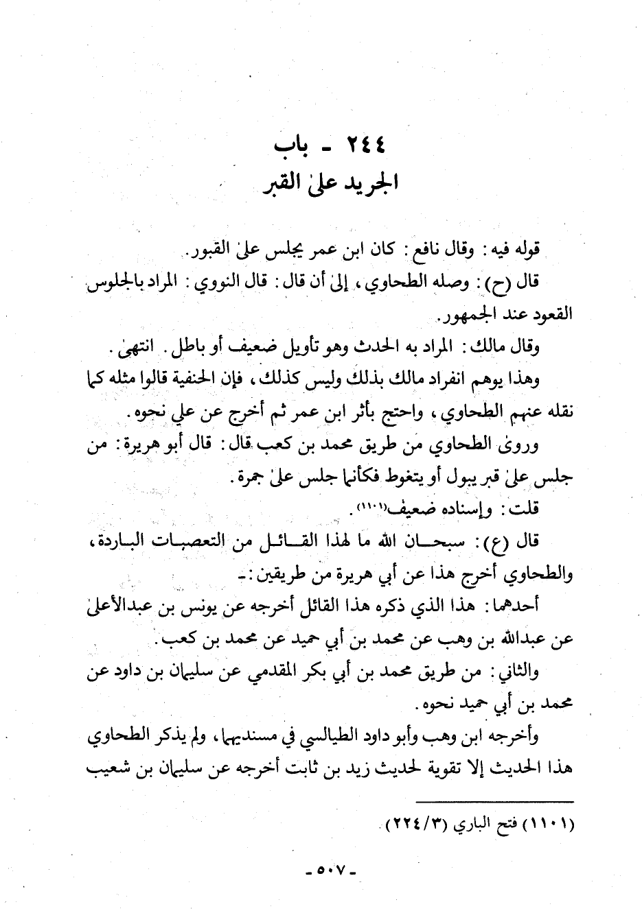 وروى الطحاوي من طريق محمّد بن كعب قال: قال أبو هريرة: من جلس على قبر يبول أو يتغوط فكأنما جلس على جمرة.