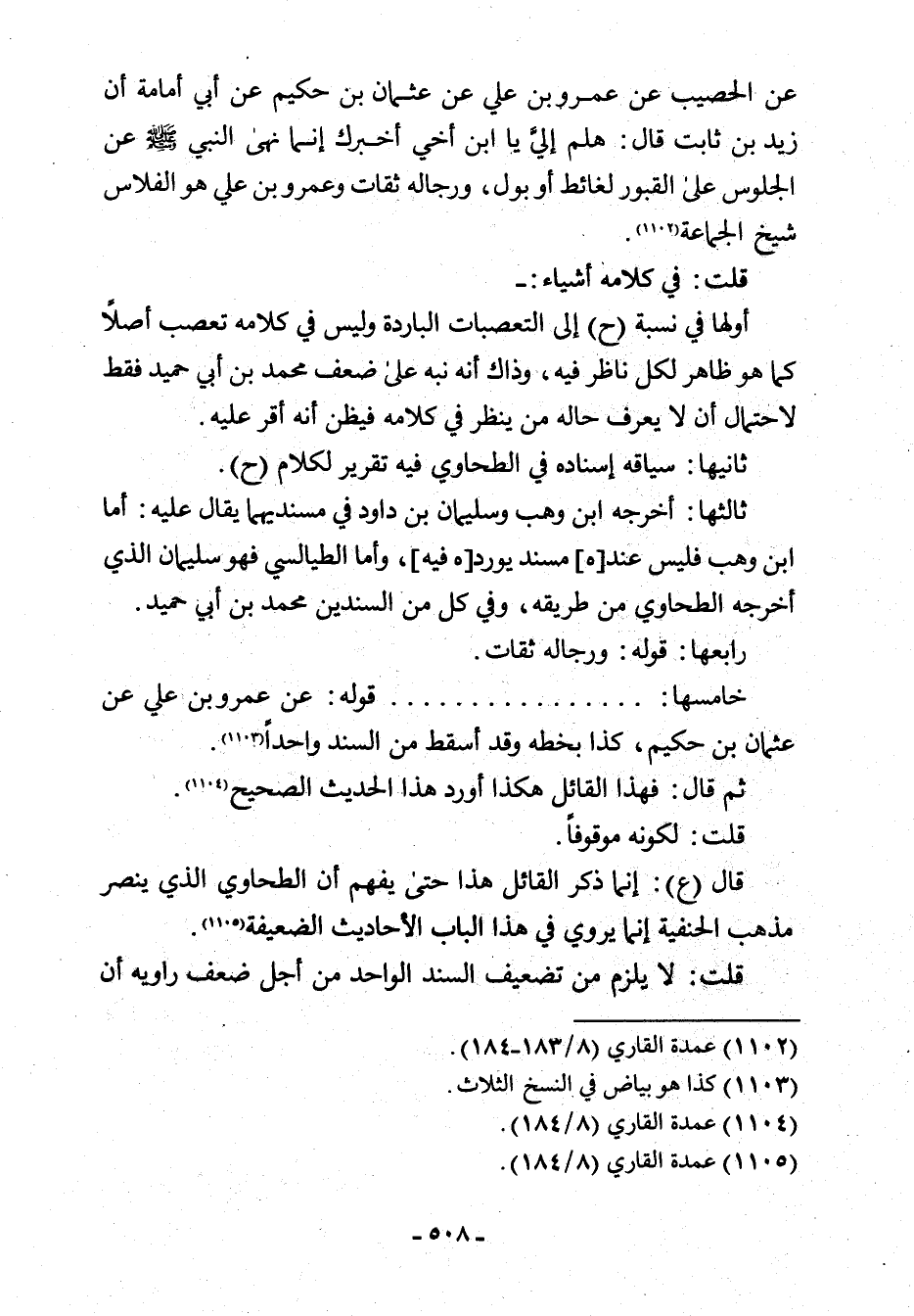 عن الحصيب عن عمرو بن علي عن عثمان بن حكيم عن أبي أمامة أن زيد بن ثابت قال: هلم إليَّ يا ابن أخي أخبرك إنّما نهى النّبيّ - صلّى الله عليه وسلم - عن الجلوس على القبور لغائط أو بول، ورجاله ثقات وعمرو بن علي هو الفلاس شيخ الجماعة (¬1102).