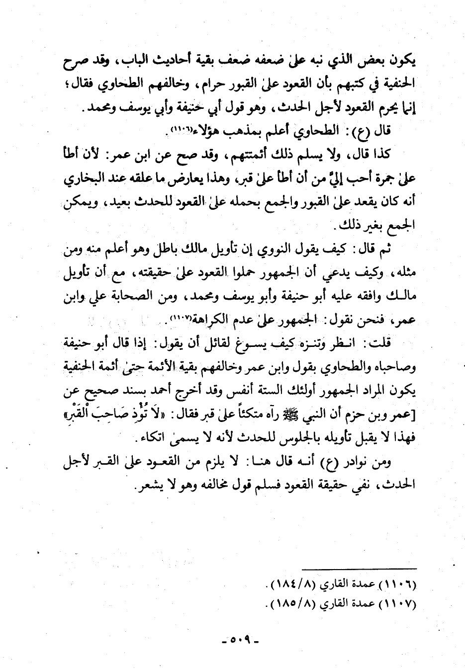 قلت: انظر وتنزه كيف يسوغ لقائل أن يقول: إذا قال أبو حنيفة وصاحباه والطحاوي بقول وابن عمر وخالفهم بقية الأئمة حتّى أئمة الحنفية يكون المراد الجمهور أولئك الستة أنفس وقد أخرج أحمد بسند صحيح عن [عمرو بن حزم أن النّبيّ - صلّى الله عليه وسلم - رآه متكئًا على قبر فقال: "لَا تُؤْذِ صَاحِبَ اْلقَبْرِ" فهذا لا يقبل تأويله بالجلوس للحديث لأنّه لا يسمى اتكاء.