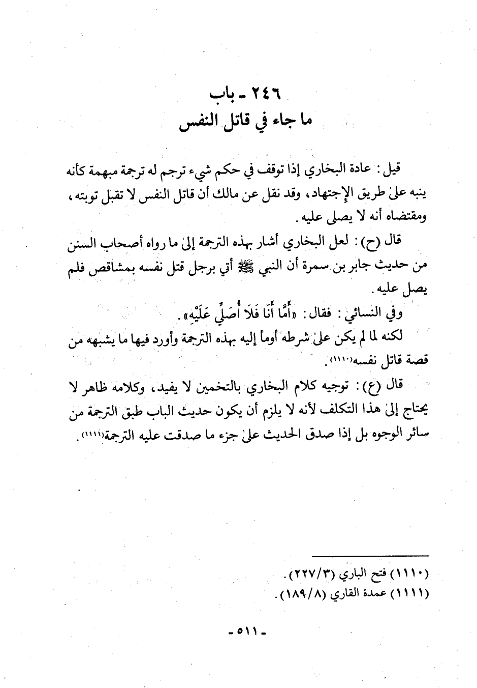 قال (ح): لعلّ البخاريّ أشار بهذه التّرجمة إلى ما رواه أصحاب السنن من حديث جابر بن سمرة أن النّبيّ - صلّى الله عليه وسلم - أتي برجل قتل نفسه بمشاقص فلم يصل عليه.