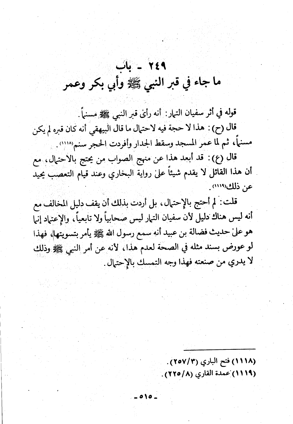 قوله في أثر سفيان التمار: أنّه رأى قبر النّبيّ - صلّى الله عليه وسلم - مسنمًا.