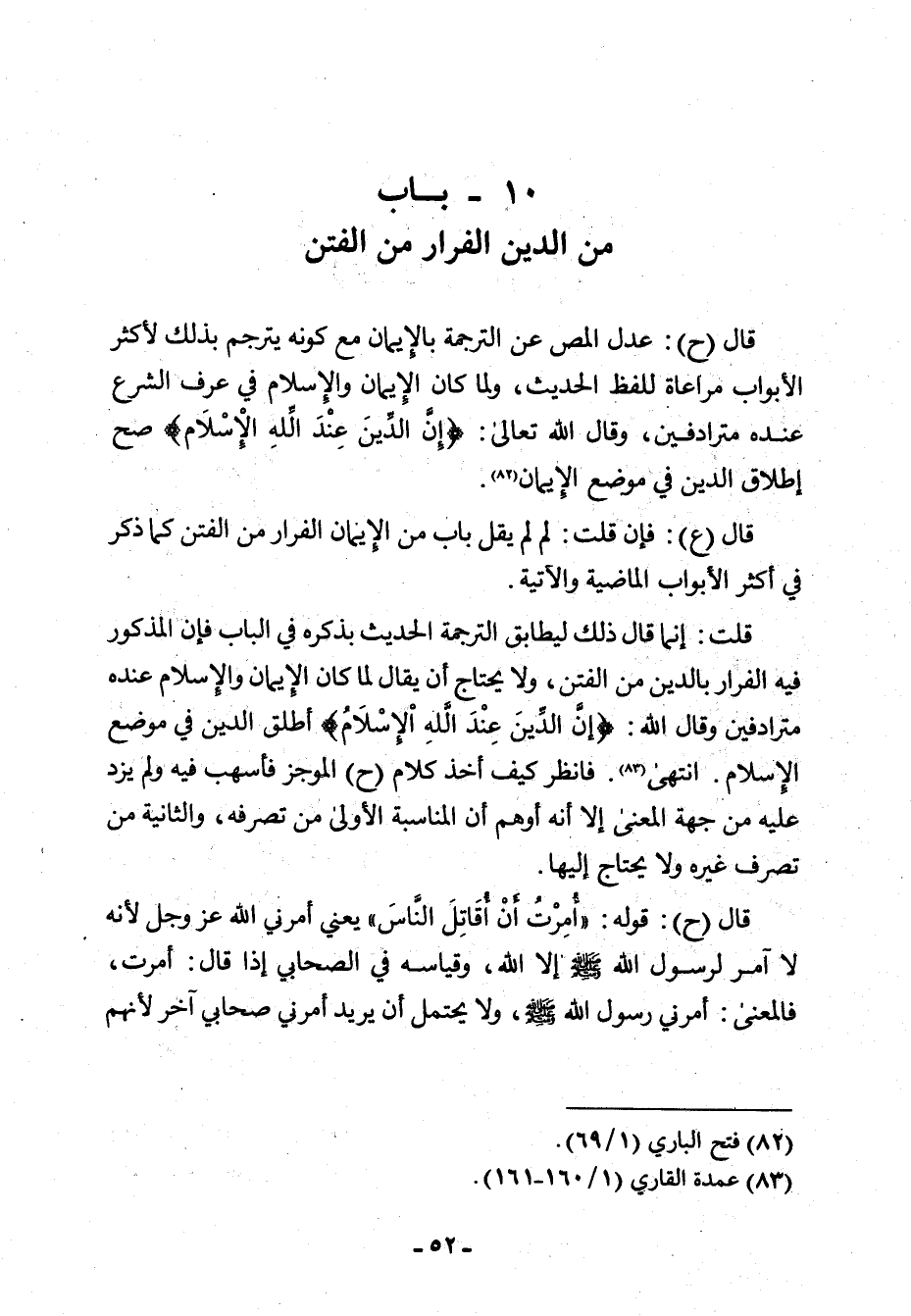 قال (ع): فإن قلت: لِمَ لَمْ يقل باب من الإيمان الفرار من الفتن كما ذكر في أكثر الأبواب الماضية والآتية.