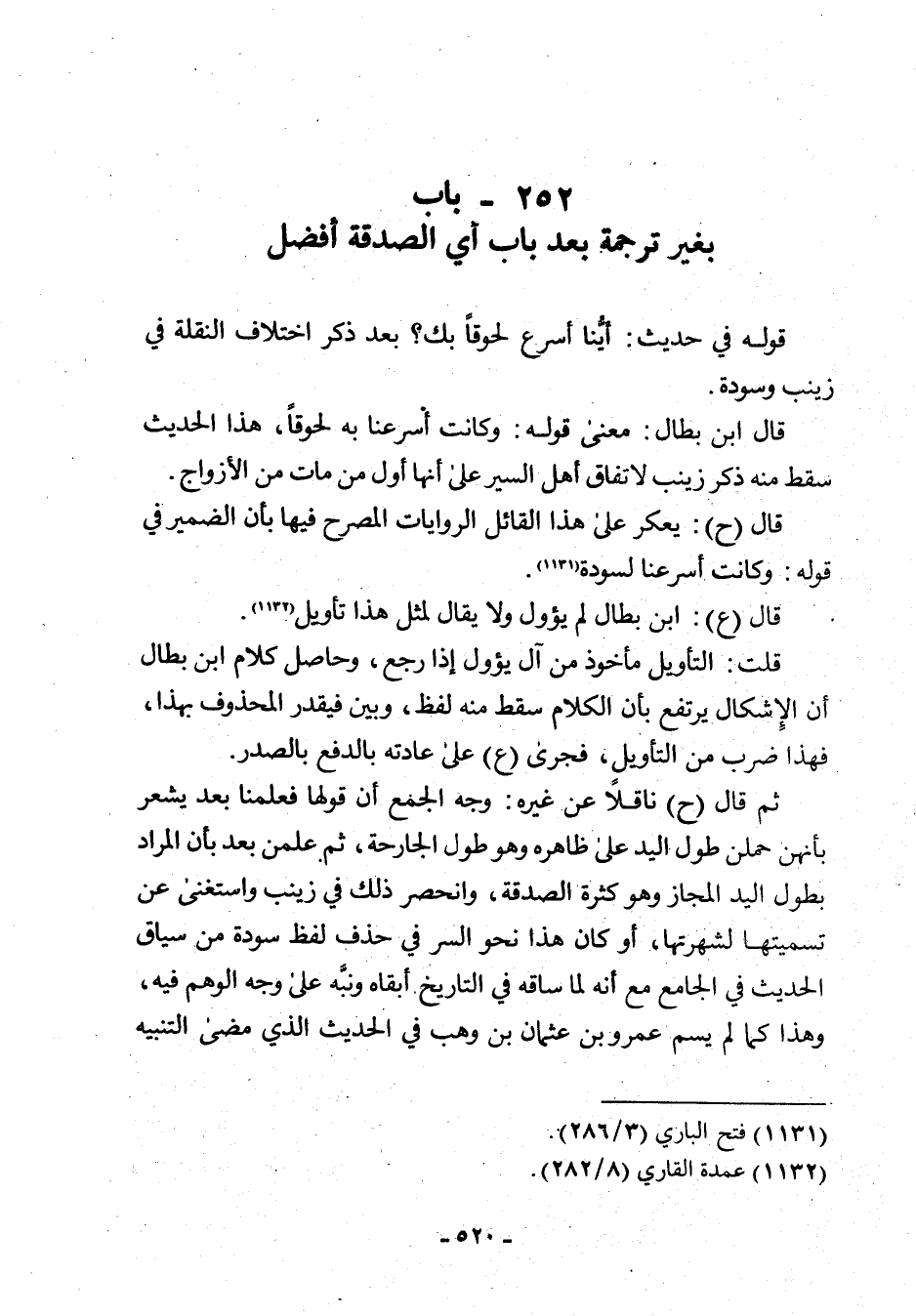 ثمّ قال (ح) ناقلًا عن غيره: وجه الجمع أن قولها فعلمنا بعد يشعر بأنّهن حملن طول اليد على ظاهره وهو طول الجارحة، ثمّ علمن بعد بأن المراد بطول اليد المجاز وهو كثرة الصَّدقة، وانحصر ذلك في زينب واستغنى عن تسميتها لشهرتها، أو كان هذا نحو السر في حذف لفظ سودة من سياق الحديث في الجامع مع أنّه لما ساقه في التاريخ أبقاه ونبَّه على وجه الوهم فيه، وهذا كما لم يسم عمرو بن عثمان بن وهب في الحديث الذي مضى التنبيه