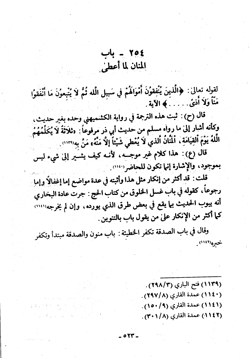قال (ح): ثبت هذه التّرجمة في رواية الكشميهني وحده بغير حديث، وكأنّه أشار إلى ما رواه مسلم من حديث أبي ذر مرفوعًا: "ثلَاثَةٌ لَا يُكلِّمُهُمُ اللهُ يَوْمَ اْلقِيَامَةِ، اْلَمنَّانُ اَّلذي لَا يُعْطي شَيْئًا إلَّا مَنَّهُ" مَنَّ بهِ (¬1139).